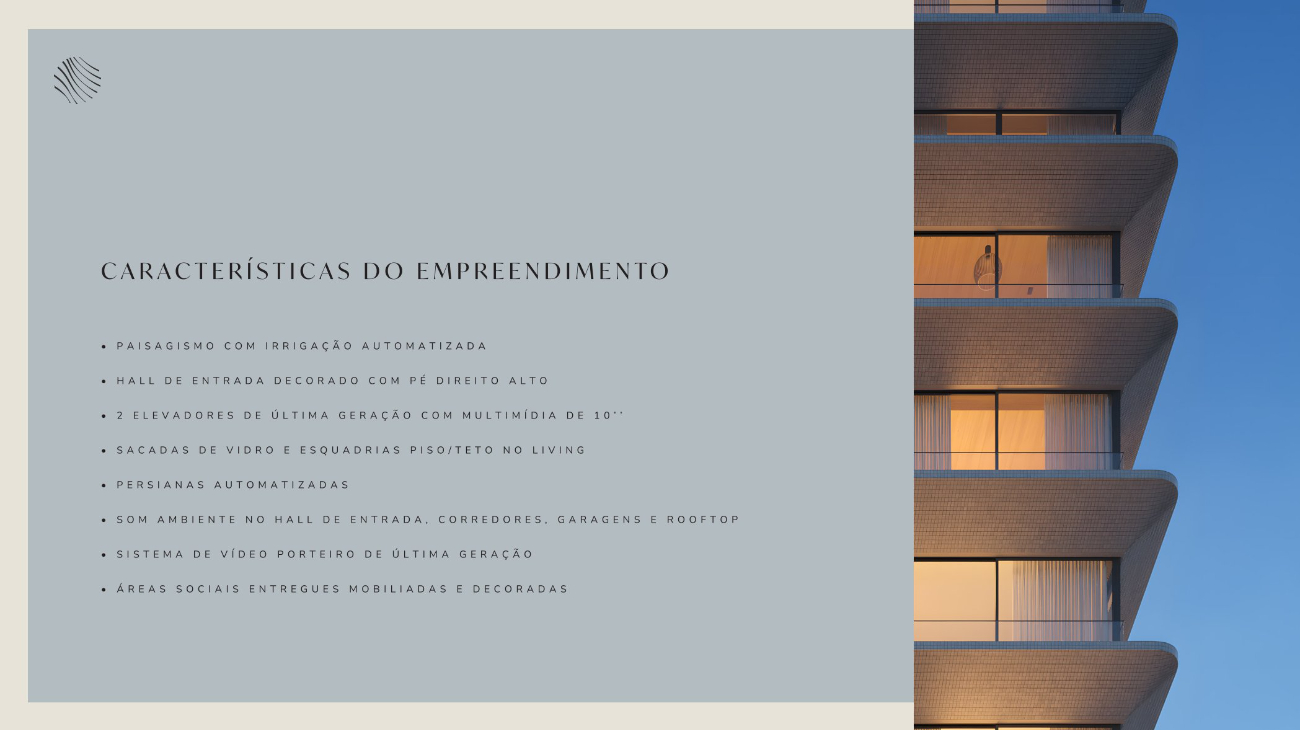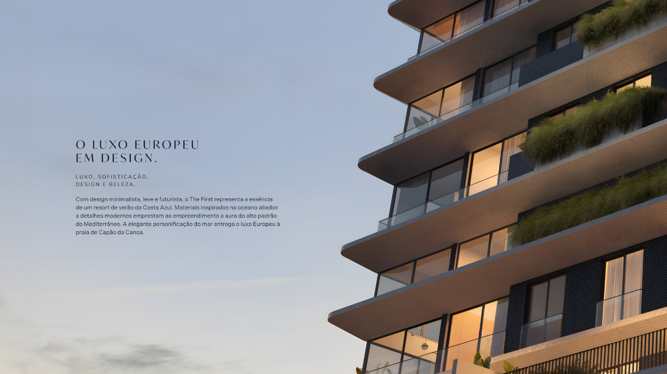 Com um design minimalista, leve e futurista, o The First captura a essência de um autêntico resort de verão da Côte d’Azur. Inspirado no oceano, seus materiais e detalhes modernos conferem ao empreendimento uma aura de alto padrão Mediterrâneo. É a elegante personificação do mar, trazendo o requinte europeu para Capão da Canoa.