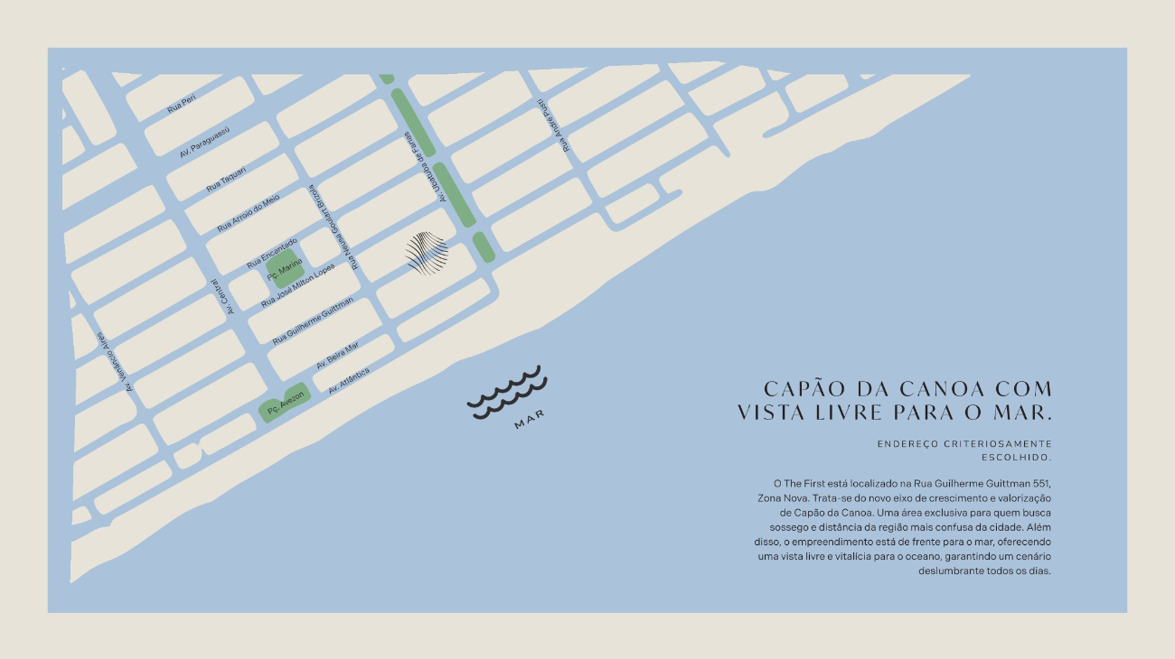 Localizado na Rua Guilherme Guittman 551, Zona Nova, o The First se destaca no novo eixo de crescimento e valorização de Capão da Canoa. Com uma localização estratégica, oferece tranquilidade e distância das áreas mais movimentadas da cidade. Além disso, proporciona uma vista livre e permanente do mar, garantindo um cenário deslumbrante todos os dias.
