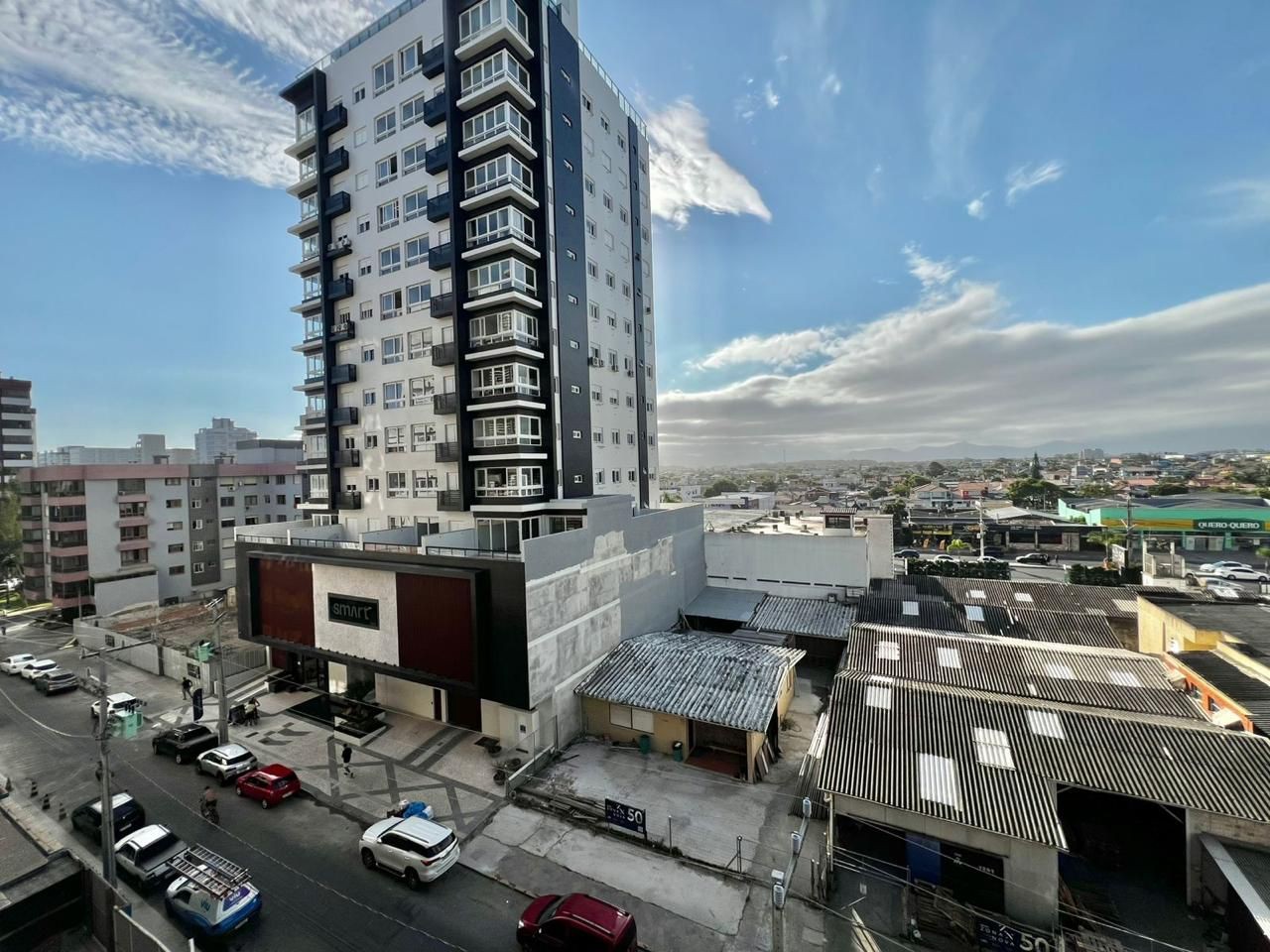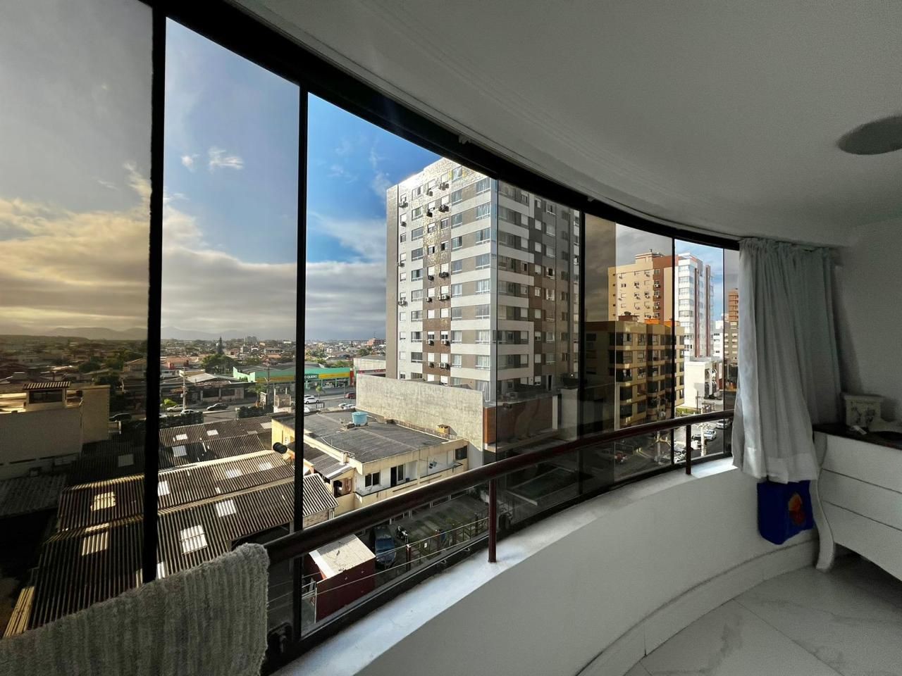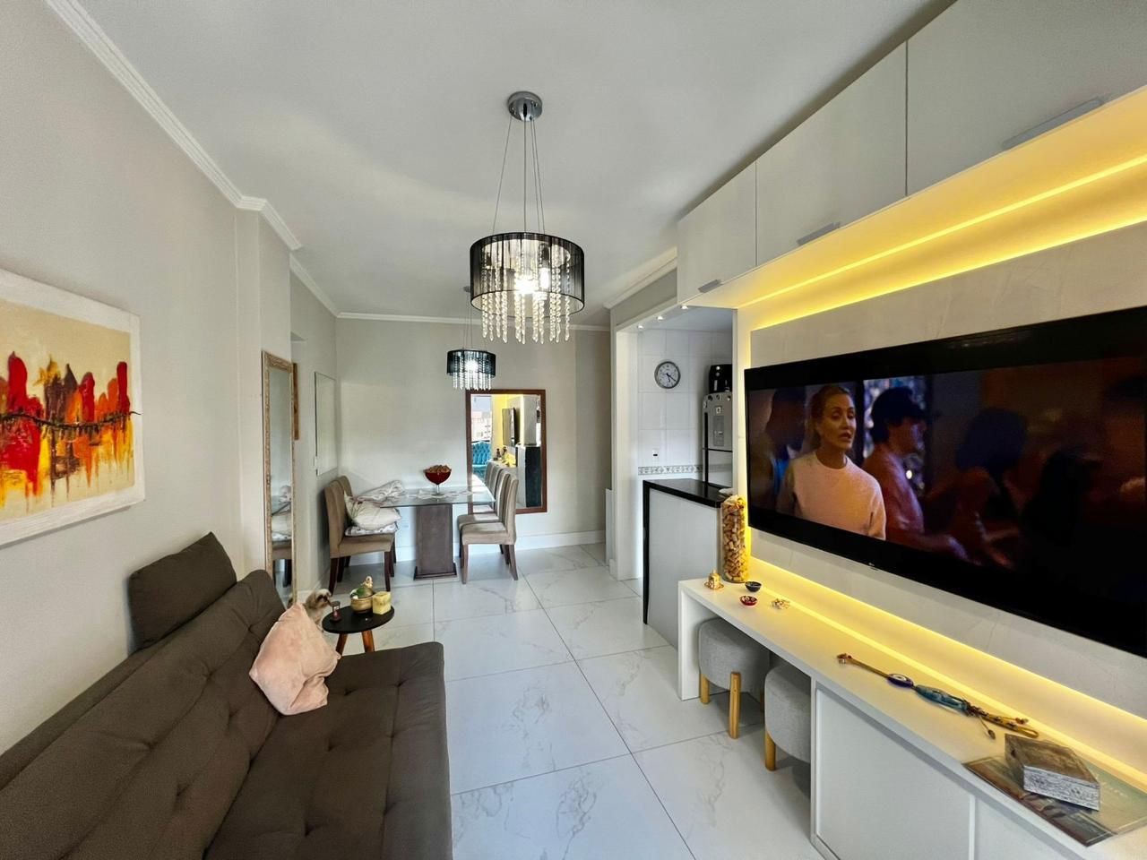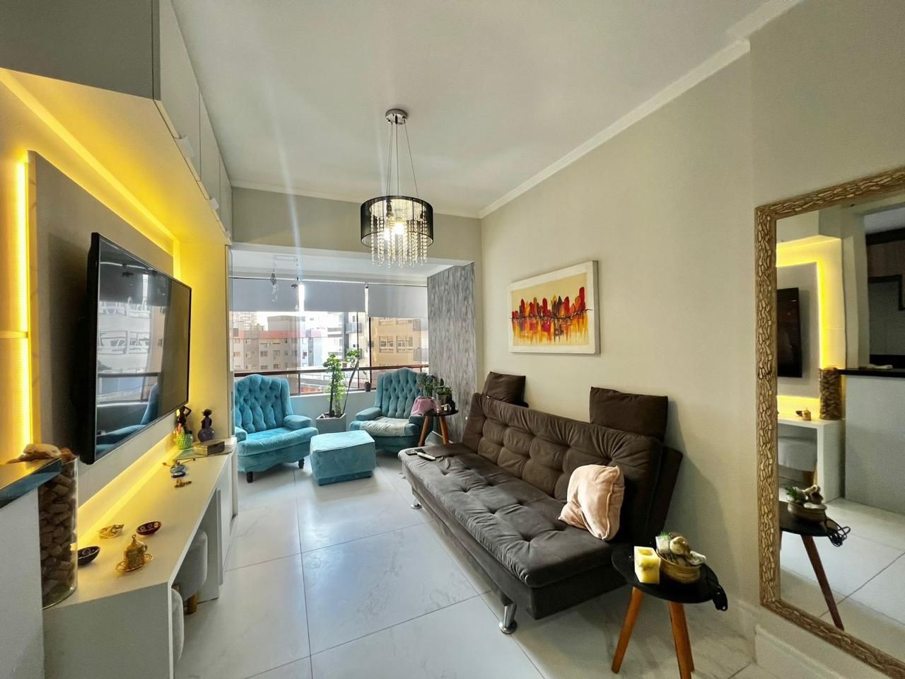 01 Dormitório com living integrado para estar e jantar, sacada de frente e totalmente mobiliado. Possui churrasqueira na sacada, cozinha americana, dormitório com sacada e é um apartamento amplo.