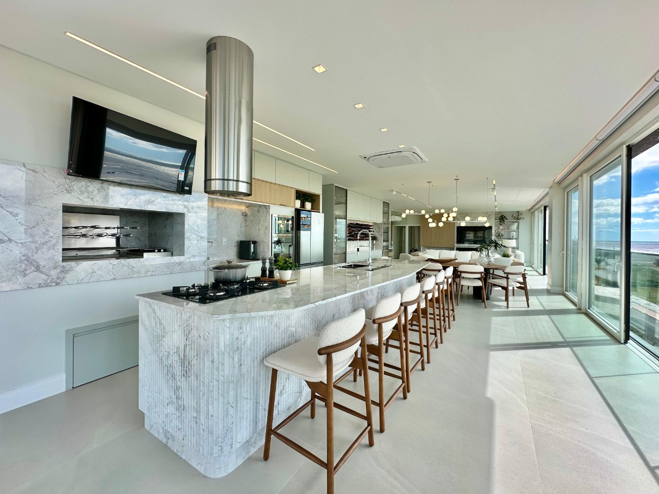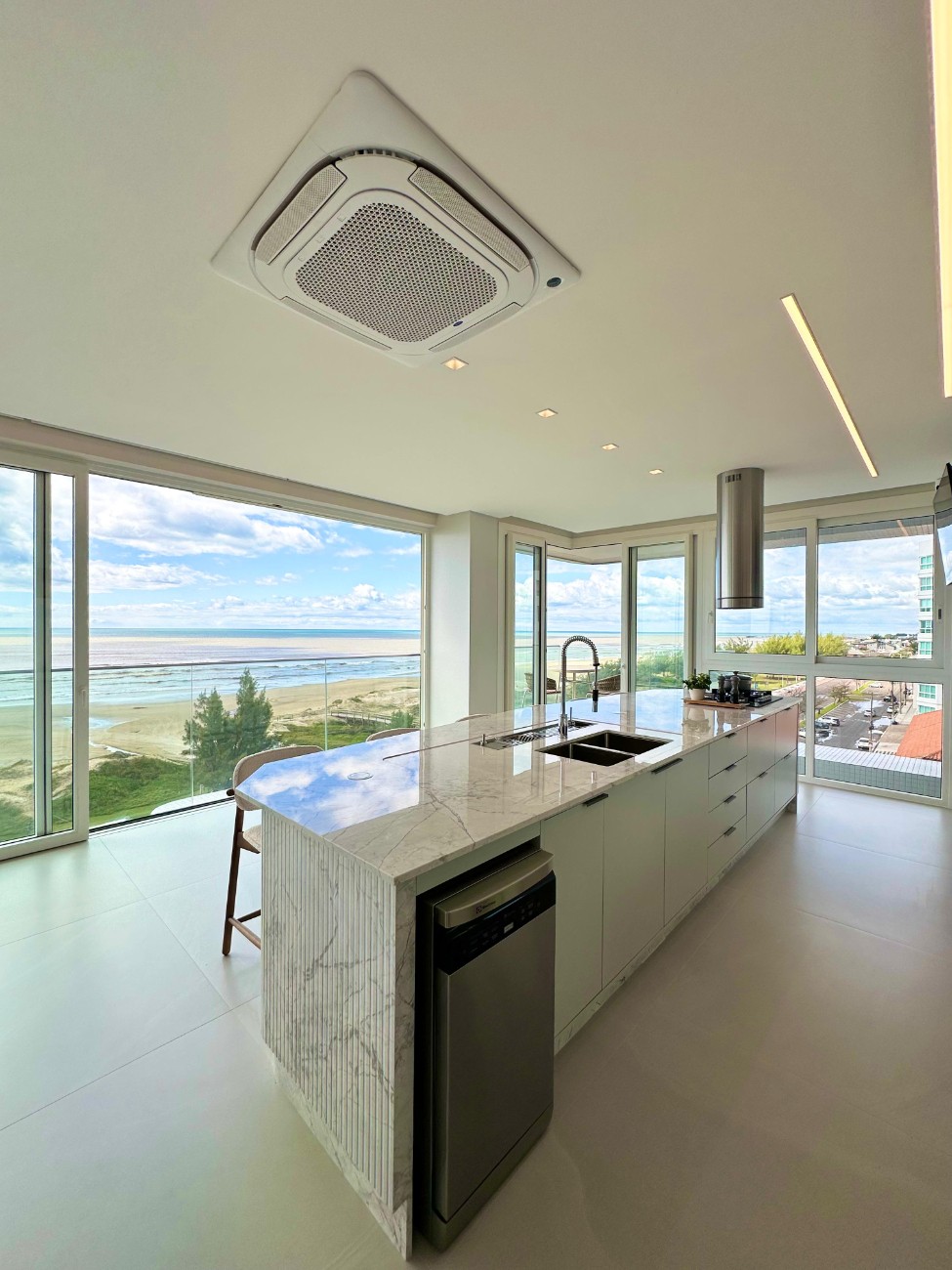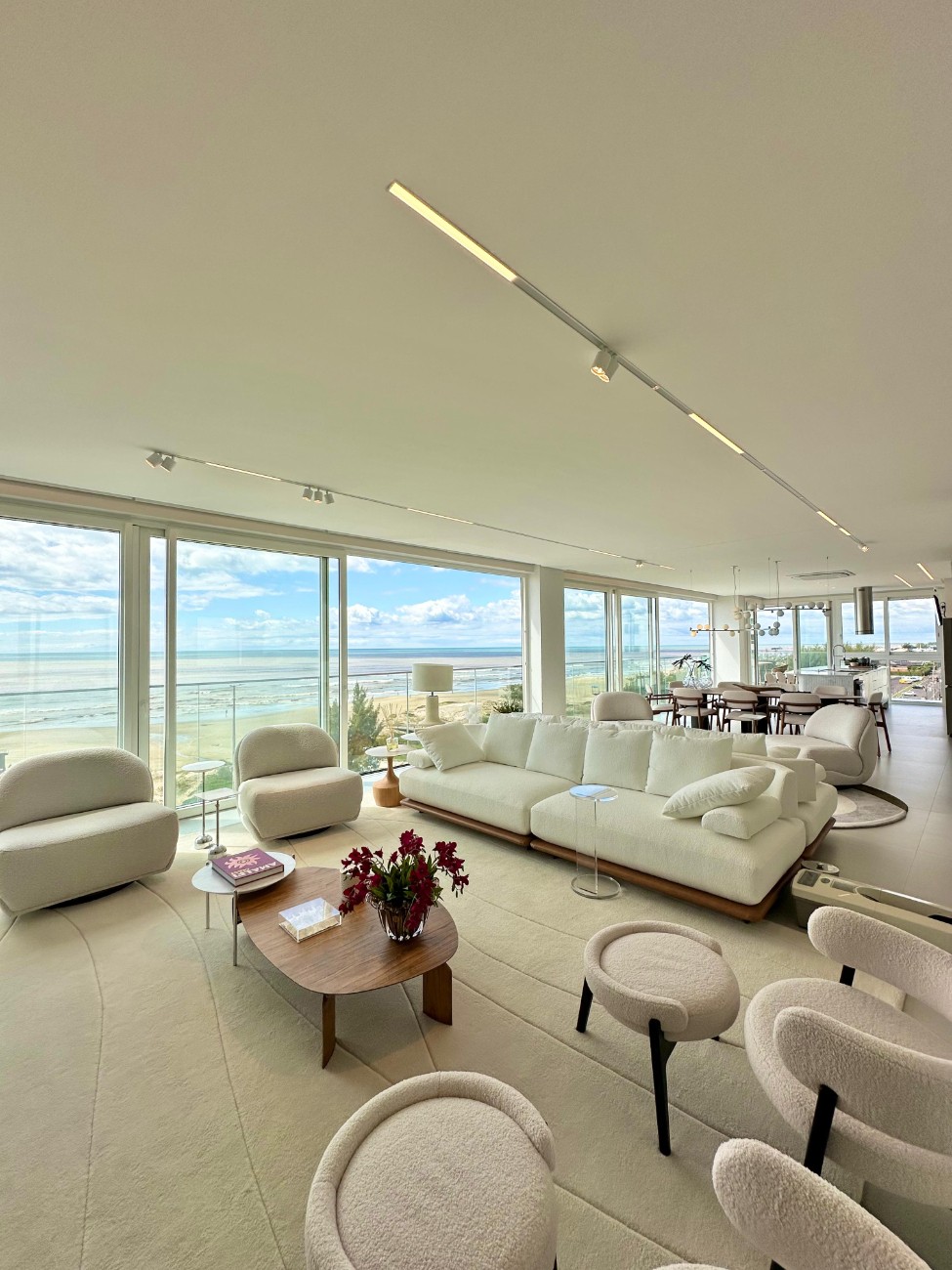 * Living com sacada e metragem ampla de 106,00 metros quadrados privativos de frente para o mar.