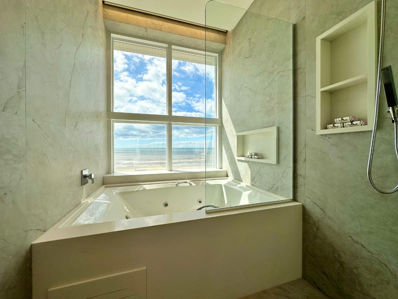 * Suíte principal com sacada privativa de frente para o mar e banheiro com jacu-ZZI.