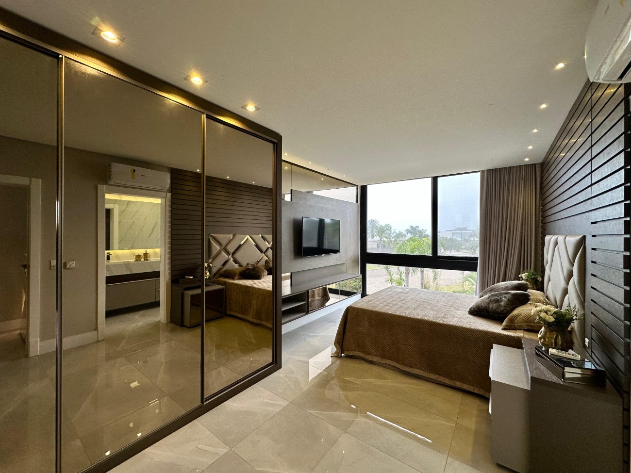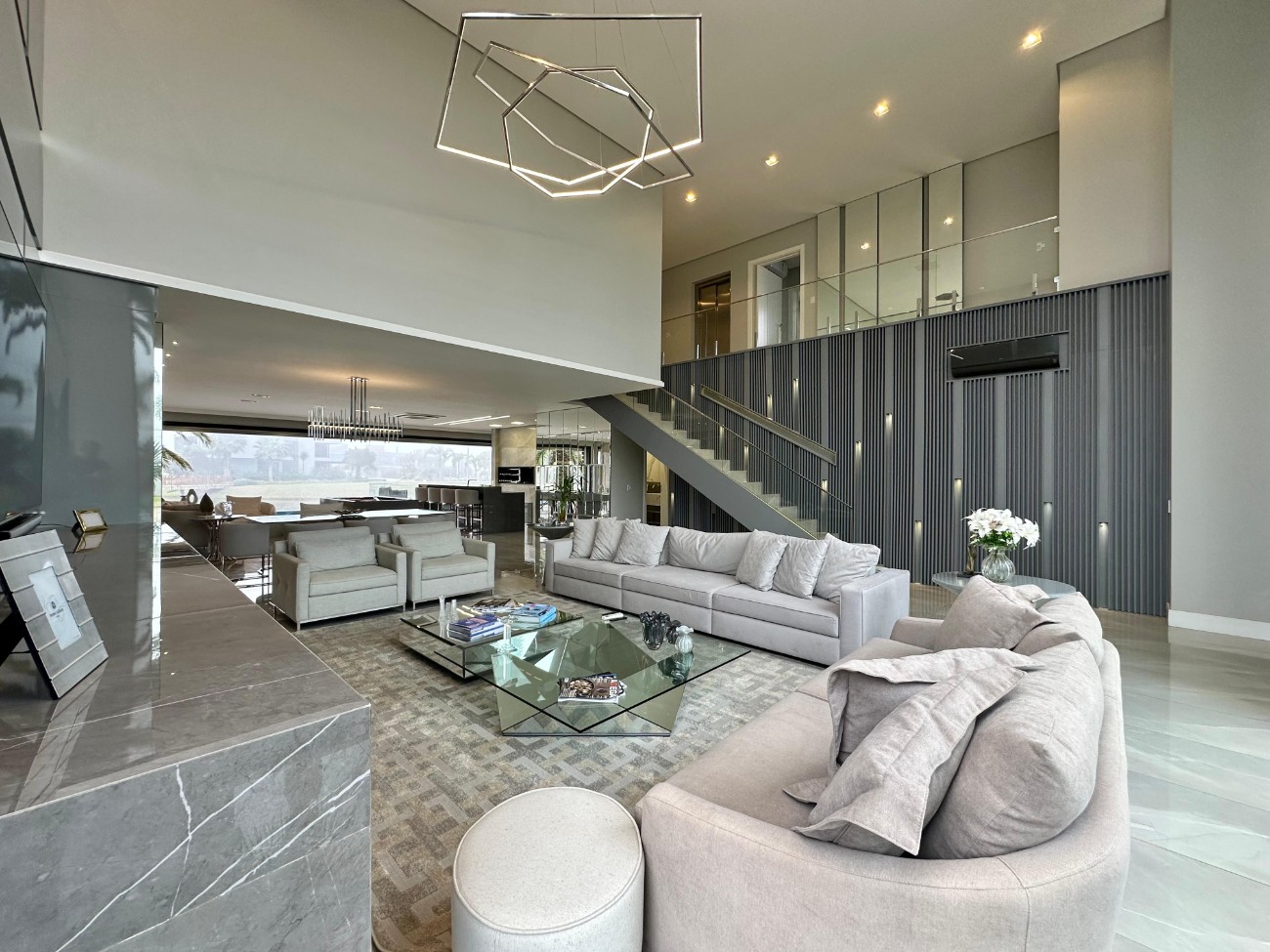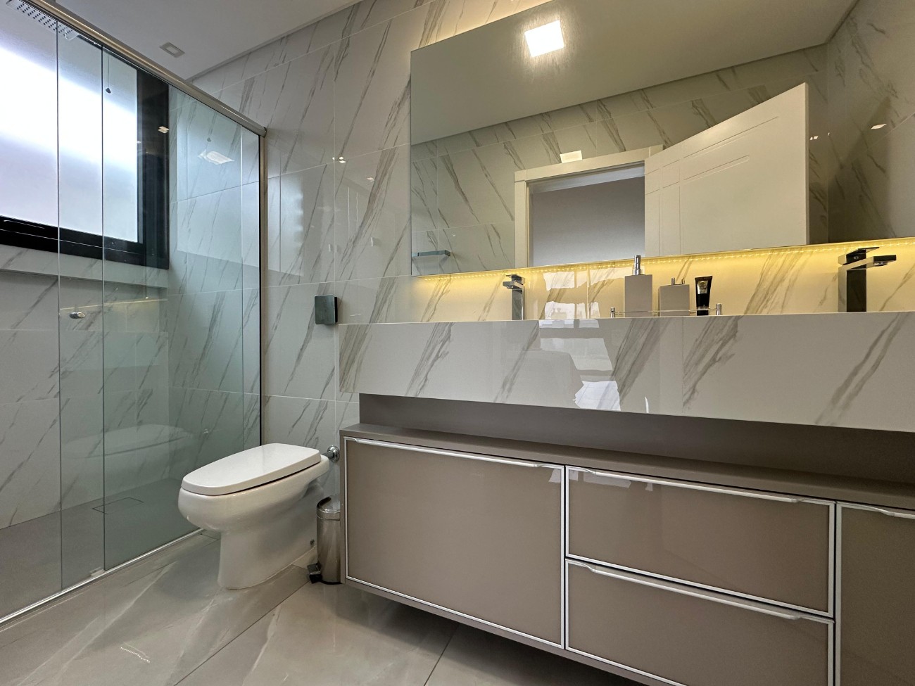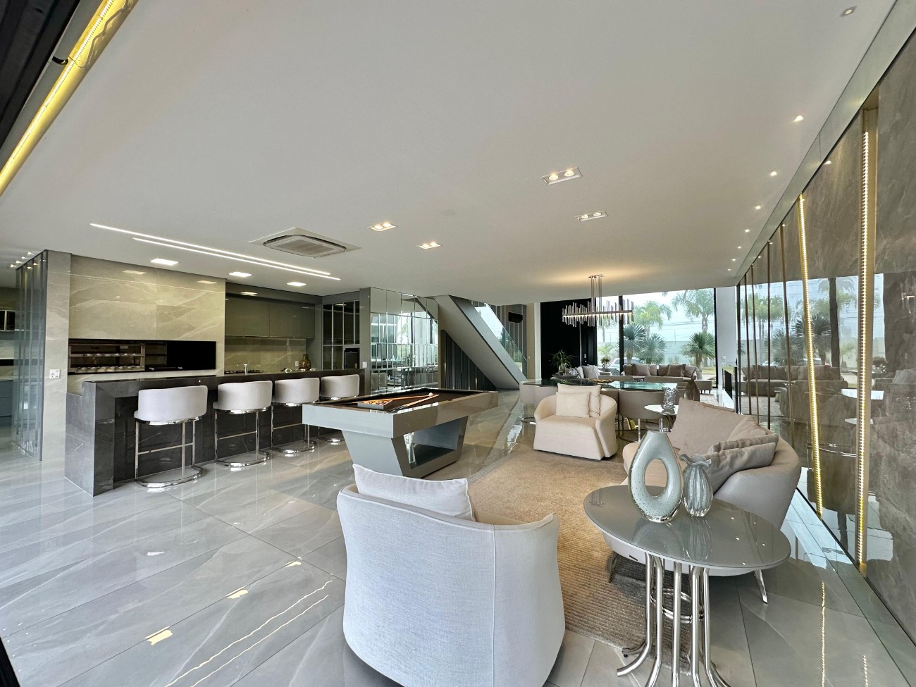 Esta ampla mansão de 477 m² privativos oferece uma vista incrível para uma área verde. Com estilo moderno, possui estacionamento para dois carros, 5 suítes (sendo uma térrea) e um living com cinco ambientes. Destaques incluem sala de cinema, cozinha gourmet, automação, piso aquecido e elevador para três pessoas. O espaço externo conta com pergolado, deck suspenso e piscina com frente em vidro, além de um pátio lateral que se conecta a 100 m² de natureza. Um verdadeiro refúgio de luxo e conforto!