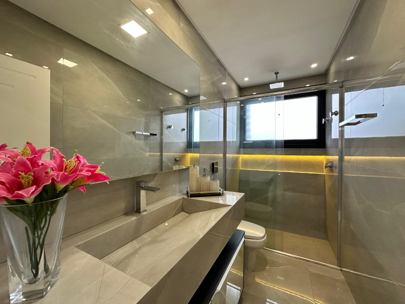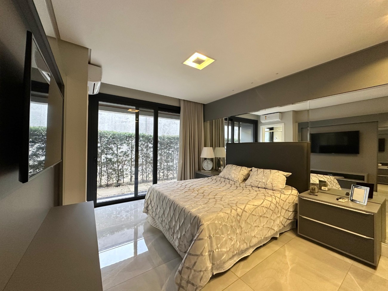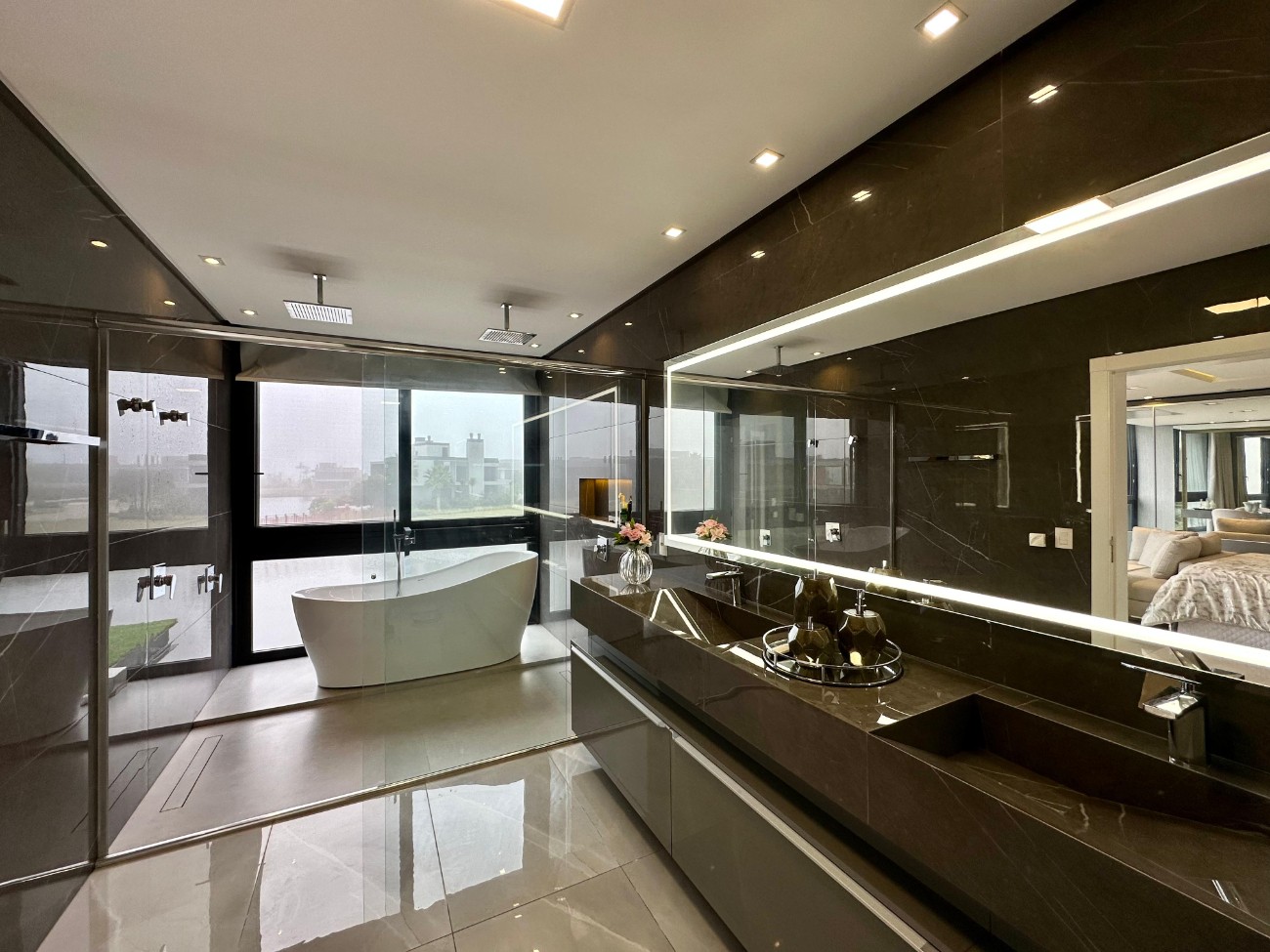 Esta ampla mansão de 477 m² privativos oferece uma vista incrível para uma área verde. Com estilo moderno, possui estacionamento para dois carros, 5 suítes (sendo uma térrea) e um living com cinco ambientes. Destaques incluem sala de cinema, cozinha gourmet, automação, piso aquecido e elevador para três pessoas. O espaço externo conta com pergolado, deck suspenso e piscina com frente em vidro, além de um pátio lateral que se conecta a 100 m² de natureza. Um verdadeiro refúgio de luxo e conforto!